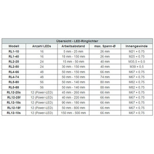 The RL12 power LED ring light offers enormous brightness thanks to its twelve 3W LEDs and is suitable for applications with increased light requirements, e.g. in conjunction with high-speed cameras. Thanks to five different versions with different geometries, the perfect lighting can be found for both small and larger working distances.
