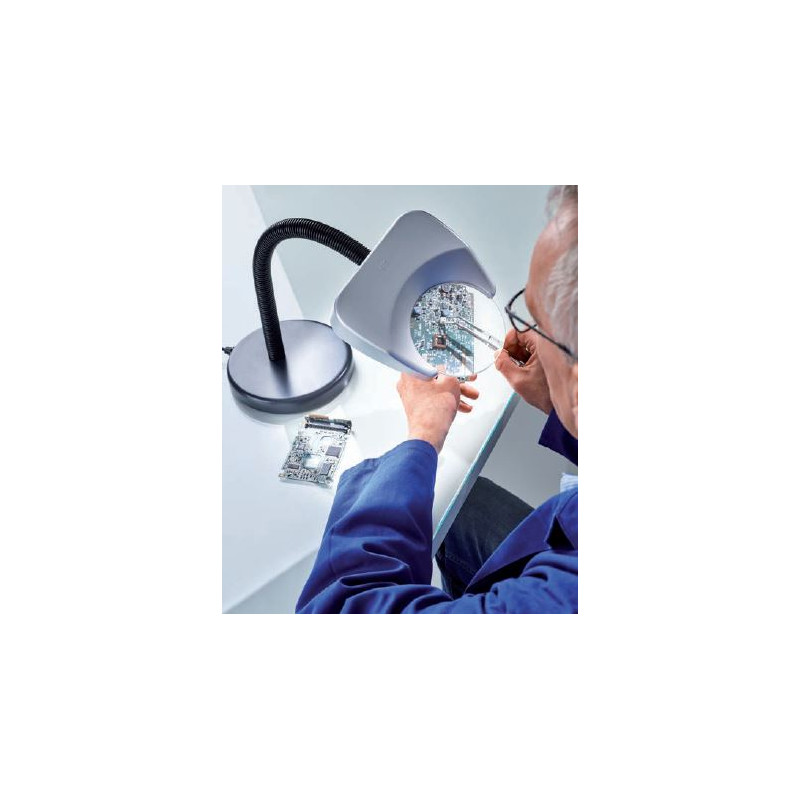 - La nostra serie Tech-Line offre lenti in vetro antigraffio aperte nella parte anteriore che consentono una posizione di lavoro molto confortevole. Ciò è possibile perché il campo visivo non è limitato da un bordo sulla testa della lente (come nelle versioni con illuminazione ad anello). È anche possibile guardare oltre la lente (orientamento ambientale) senza problemi.