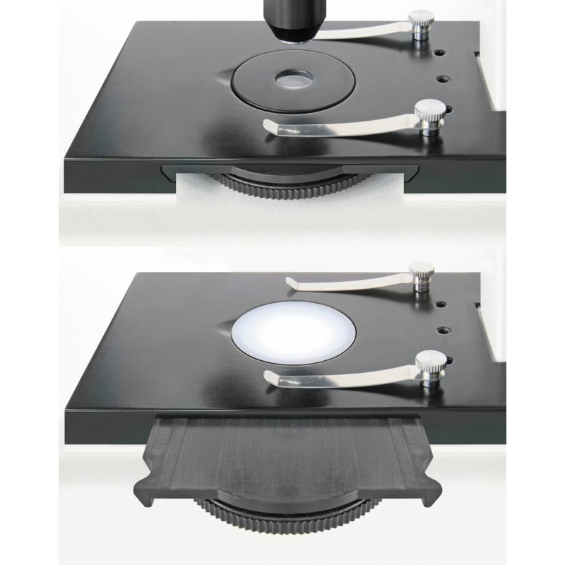 L'illuminazione si può alimentare da rete o con batterie. Illuminazione superiore e luce trasmessa si possono regolare individualmente ed all'occorrenza si possono spegnere. Per la microscopia a luce trasmessa, il fatto che il tavolo sia dotato di una ruota portafiltri è un ulteriore comodità. Un'altra novità del Bresser Duolux è il cassetto integrato, nel quale si possono trasportare in tutta sicurezza i numerosi accessori di cui si ha bisogno.