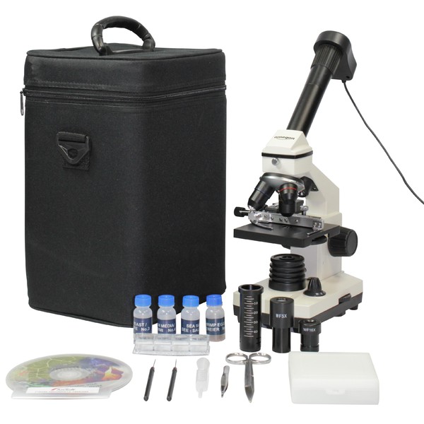 Quello che vi serve per cominciare, è già tutto compreso: oculare digitale per trasferire i dai su PC, un software per lavorare le immagini, una lente di Barlow per ingrandimenti superiori, numerosi attrezzi per microscopia, uno strumento per tagli di precisione, preparati permanenti, incubatrice, uova di gamberetto, sale marino, lievito, 10 vetrini portaoggetto e coprioggetto, valigetta da trasporto e alimentatore.